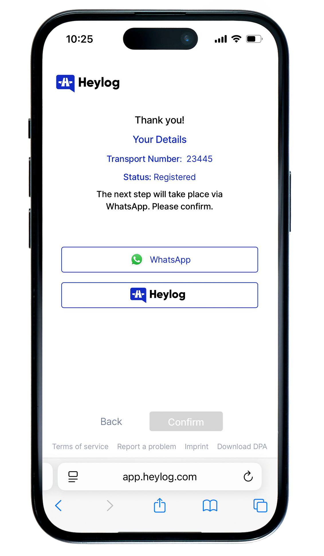 Heylog kommuniziert direkt mit dem Fahrer – über WhatsApp, SMS oder Link. Echtzeit-Status für Tor & Rampe inklusive.
